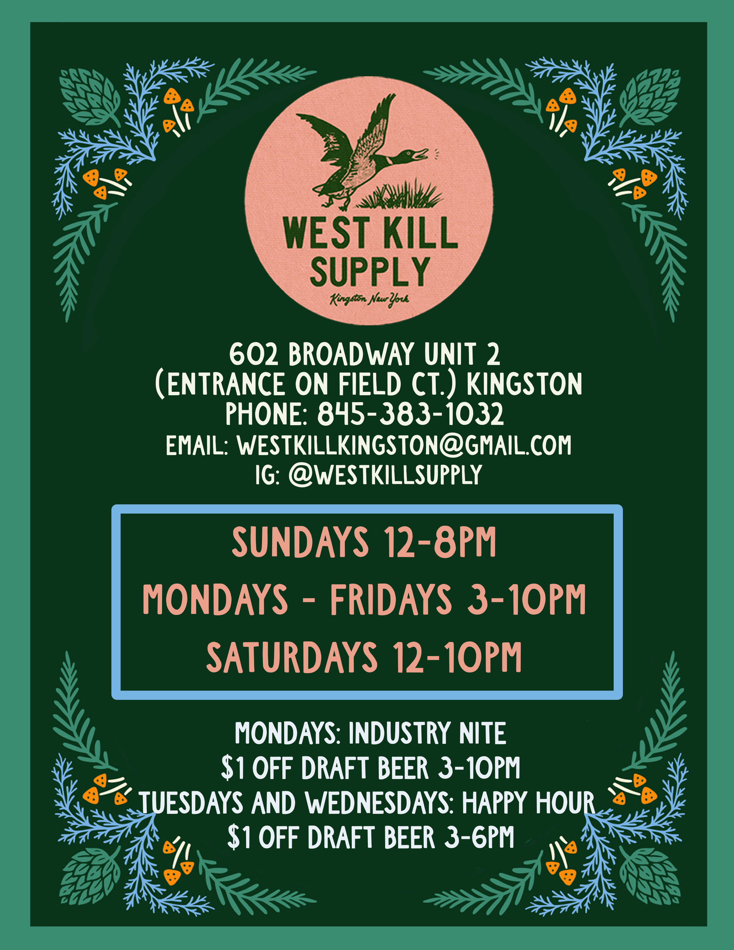 Kingston Taproom (845)383-1032 westkillkingston@gmail.com IG: @westkillsupply 602 Broadway Unit 2 Kingston NY 12401